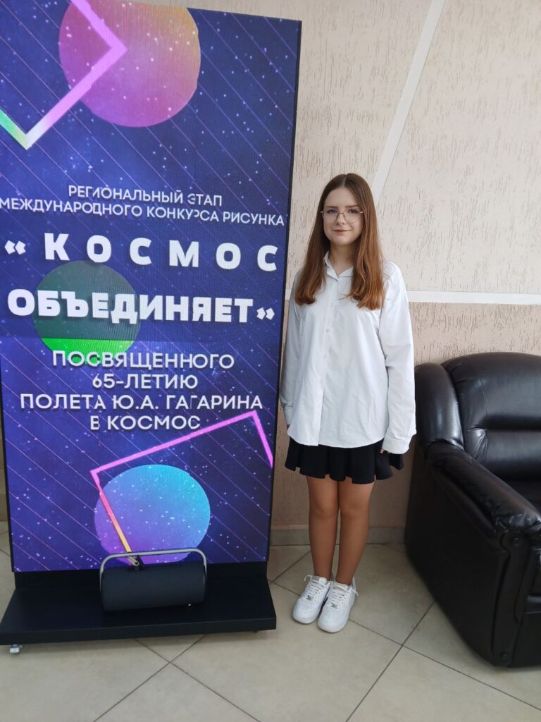 В региональном этапе Международного конкурса рисунков «Космос объединяет», посвящённому 65-летию полёта Ю.А.Гагррина в космос, приняла участие учащаяся художественного отделения Пограничного филиала ГУО «Берестовицкая ДШИ» дочь сотрудника ЦБУ 401 ОАО «Беларусбанк» Анастасия Макась.