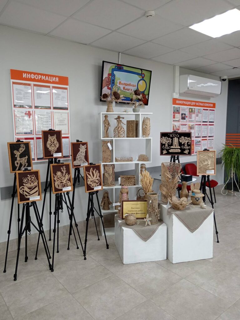 Сотрудники и клиенты банка могут познакомиться с творческими работами и приобрести понравившиеся картины, шкатулки, вазы, куклы, корзинки, салфетницы и др.